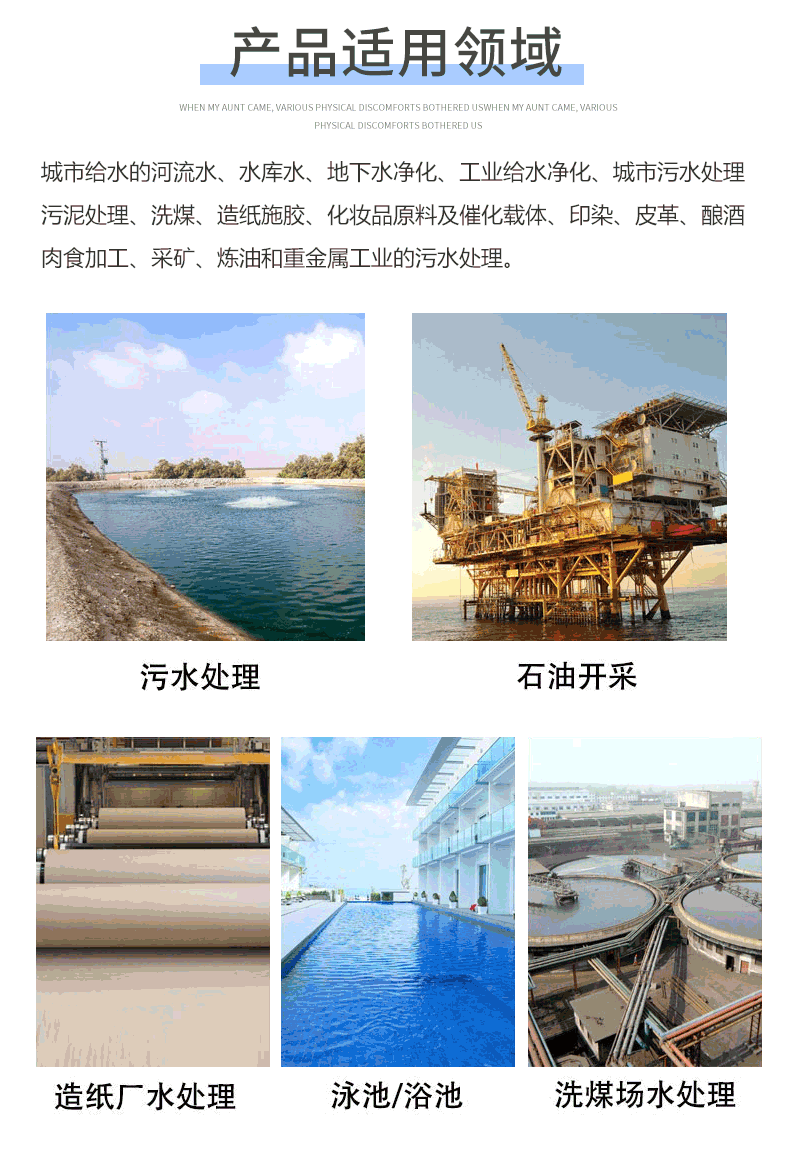 聚氯化鋁易溶于水,有較強(qiáng)的架橋吸附性能,在水解過(guò)程中,伴隨發(fā)生電化學(xué)、凝聚、吸附和沉淀等物理、化學(xué)變化。該產(chǎn)品主要用于飲用水的凈化和工業(yè)污水的處理,如含放射性物質(zhì)、含鉛(Pb++)鉻(Cr+++)高毒性重金屬和含氟(F)污水等。此外在高精鑄造、造紙、制革等方面亦有廣泛用途。聚氯化鋁是一種無(wú)機(jī)高分子混凝劑,簡(jiǎn)稱為聚鋁,英文簡(jiǎn)稱PAC,由于氫氧根離子的架橋作用和多價(jià)陰離子的聚合作用而生產(chǎn)的分子量較大、電荷較高的無(wú)機(jī)高分子水處理藥劑。聚合氯化鋁是一種新型凈化材料,無(wú)機(jī)高分子混凝劑,又被簡(jiǎn)稱為聚鋁,它是由于氫氧根離子的架橋作用和多價(jià)陰離子的聚合作用而產(chǎn)生的分子量較大、電荷較高的無(wú)機(jī)高分子水處理藥劑。聚合氯化鋁呈金黃色、土黃色、褐色、紅色顆粒狀/片狀,凈化后的水質(zhì)優(yōu)于硫酸鋁混凝劑,凈水成本與之相低15-30%,絮凝體形成快、沉降速度快,比硫酸鋁等傳統(tǒng)產(chǎn)品處理能力大,它能消耗水中堿度低于各種無(wú)機(jī)混凝劑,因而可不投或少投堿劑,適用的原水PH范圍為5.0-9.0, 其腐蝕性小,操作條件好,溶解性優(yōu)于硫酸鋁,對(duì)源頭溫度的適用性優(yōu)于硫酸鋁等無(wú)機(jī)混凝劑。